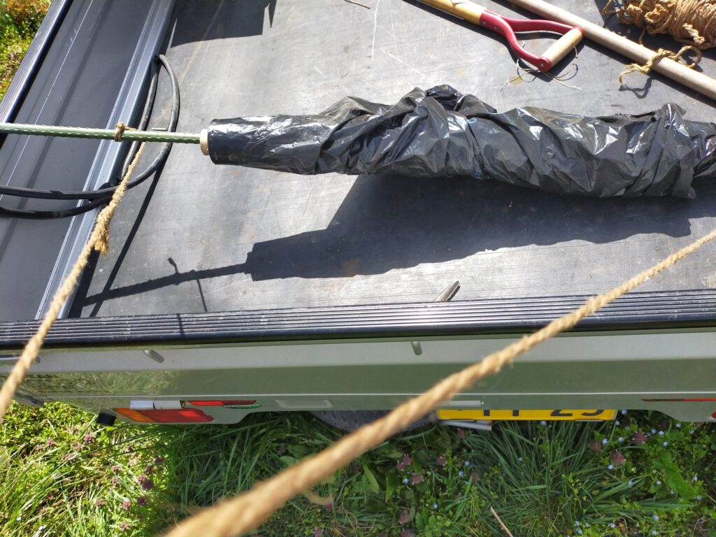 マルチの筒に通す棒の両端をひもでつなぎ、そのひもを引っ張るのです。