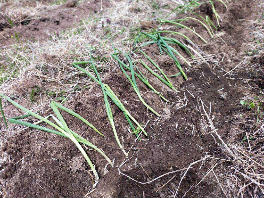 長ネギ用に掘った畝に松本一本ネギを横たえる