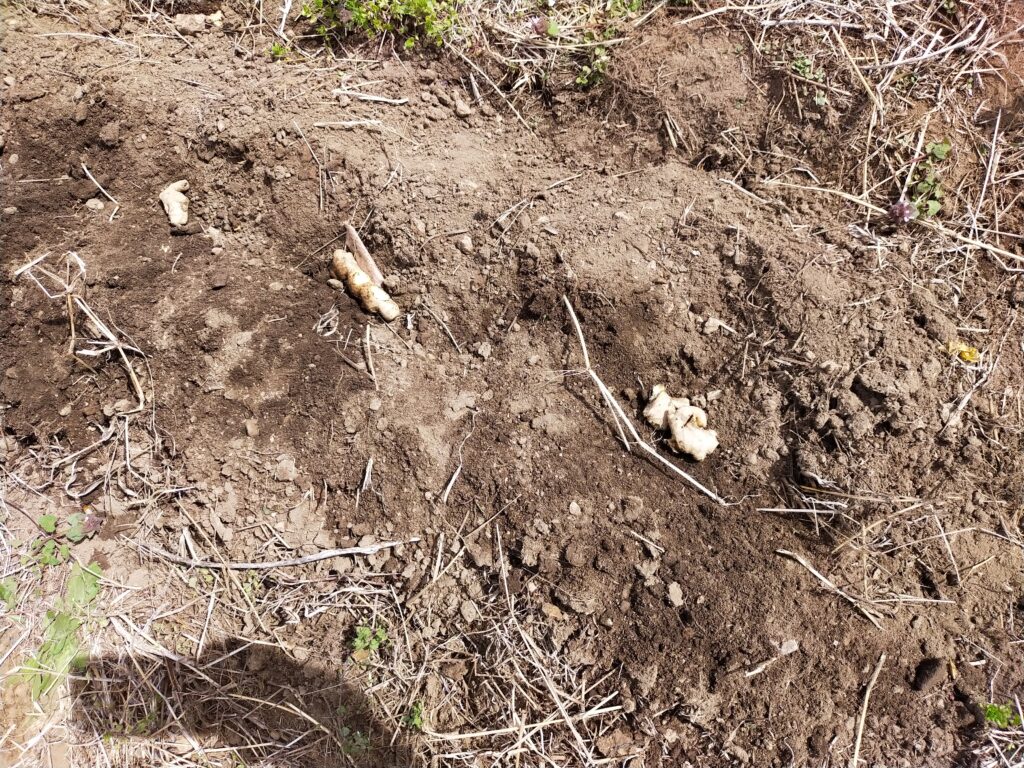 男爵1キロでは畝1列が埋まりませんので、途中から春ウコンの種芋を蒔きます。