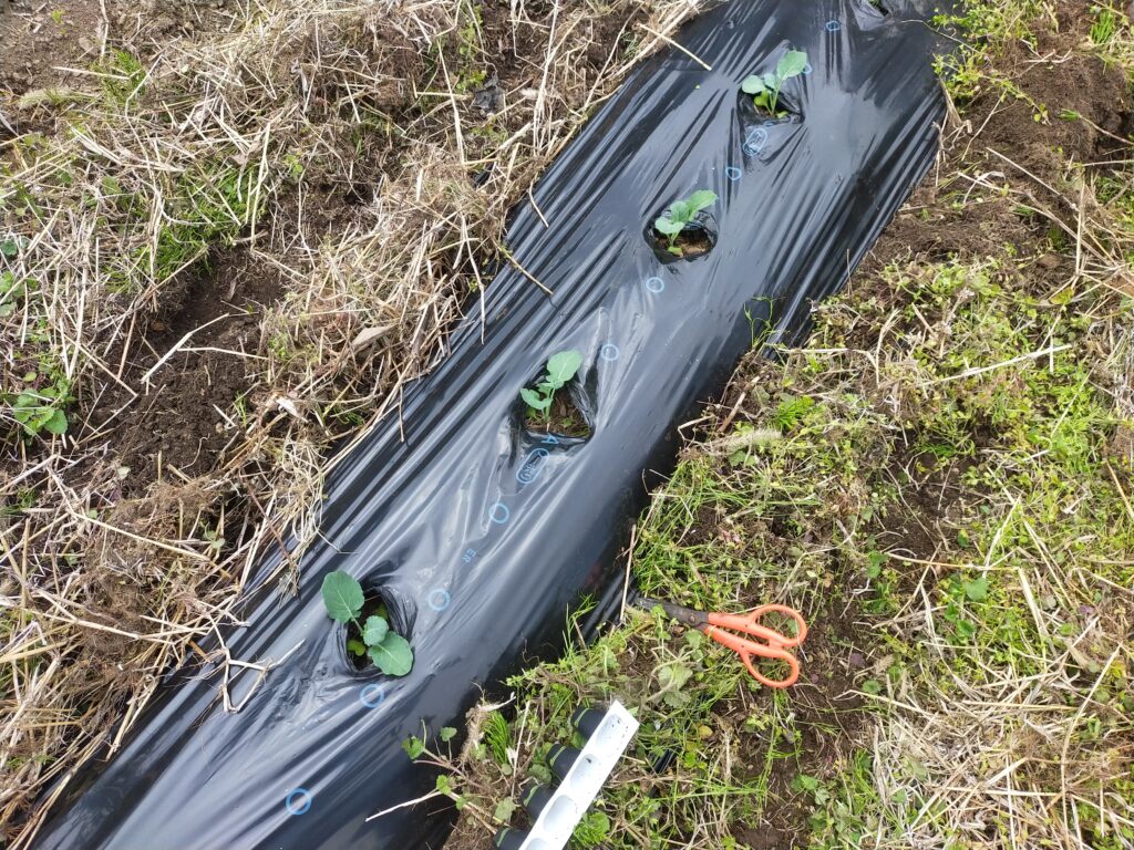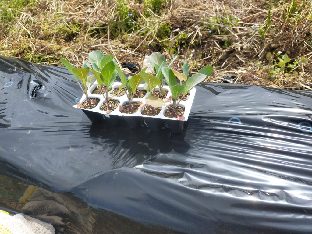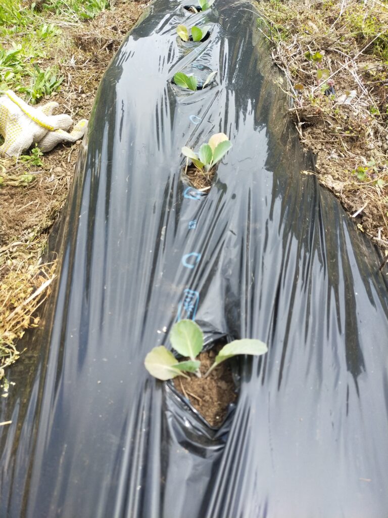 マルチを強いた畝にキャベツを定植