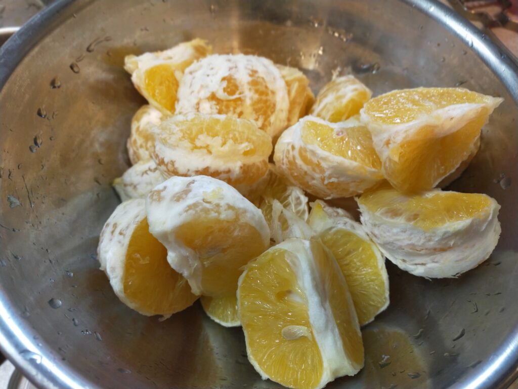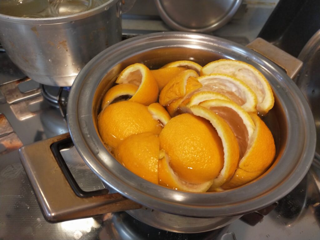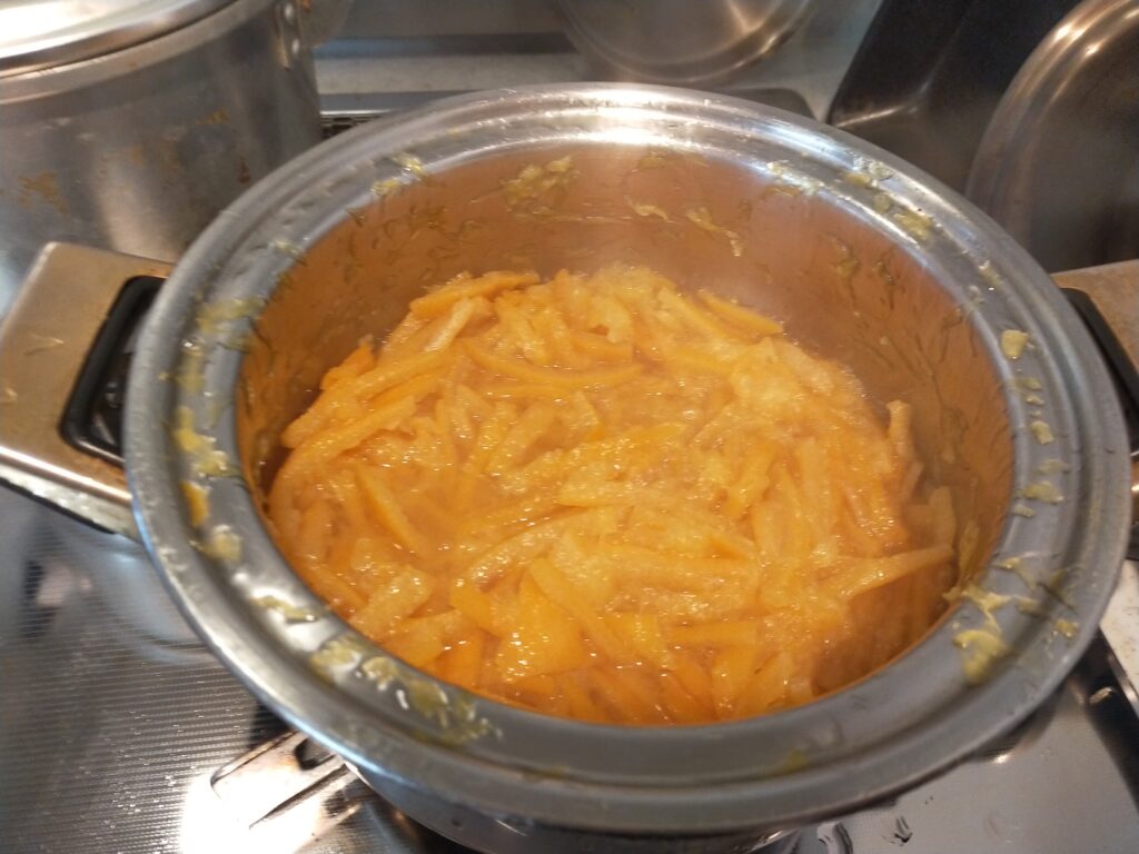 内側のワタはついたまま、皮を茹でて行きます。