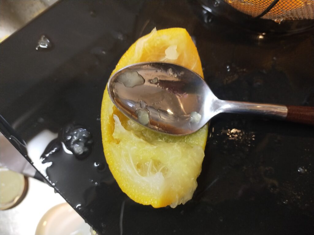 30分くらい煮て柔らかくなった皮の内側をスプーンでそいで、ワタを取り去ります。