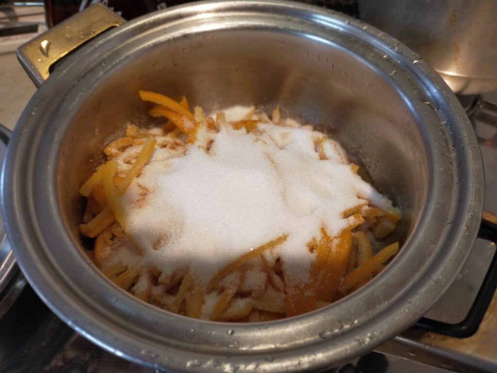 皮は千切りにしてグラニュー糖をまぶします。
