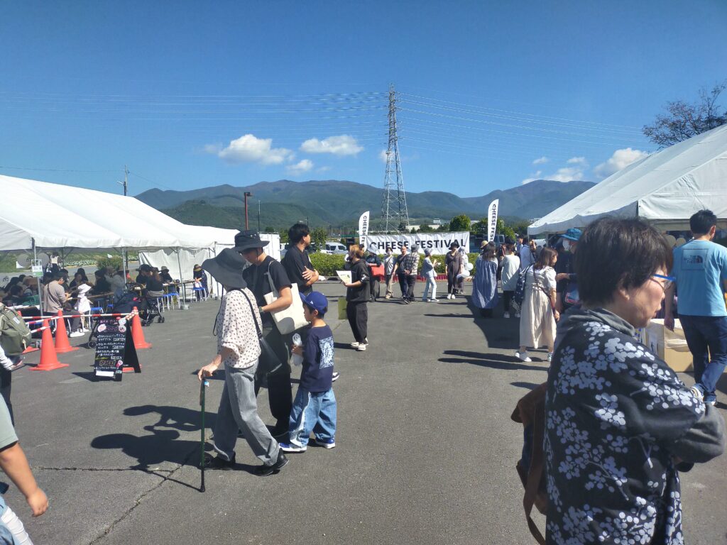 チーズ工房のテントが並んでおり、いかにも初々しい店子さんが接客しています。