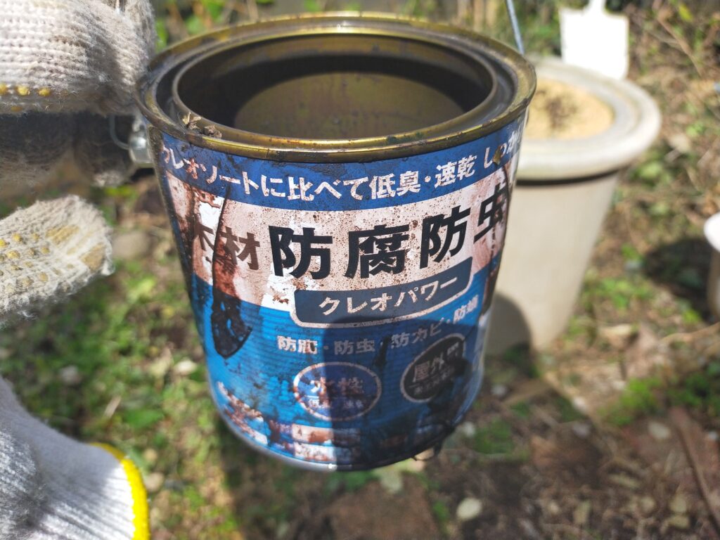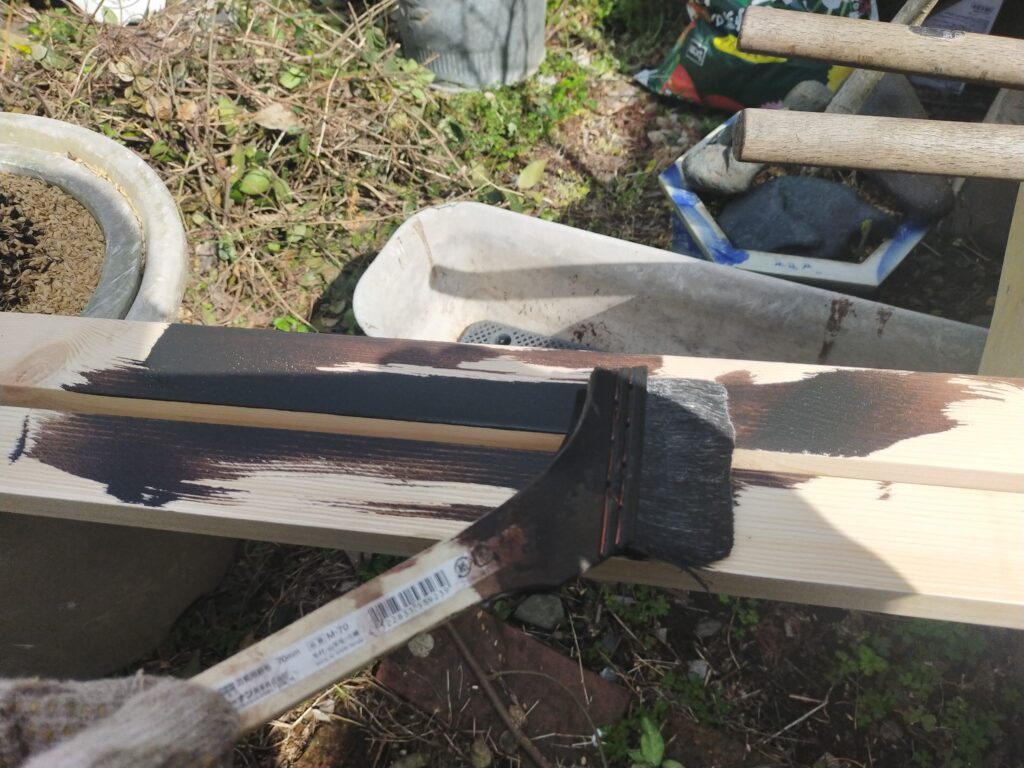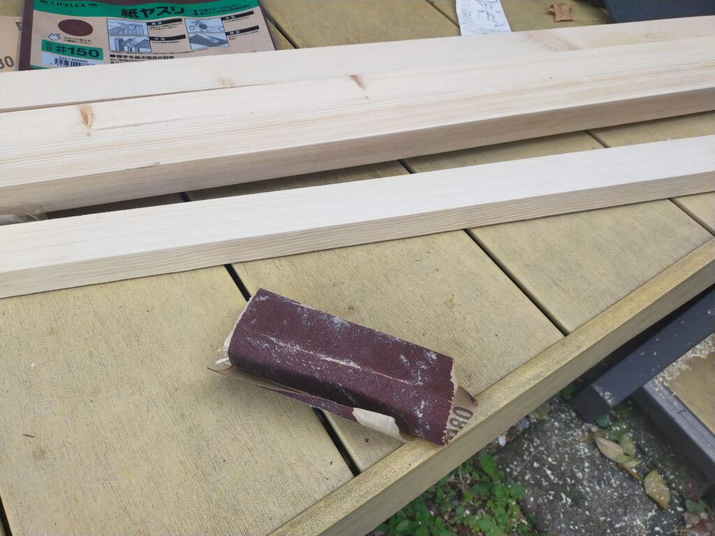 垂木は長さにカットして、紙やすりで表面を削ってから防腐塗装をします。