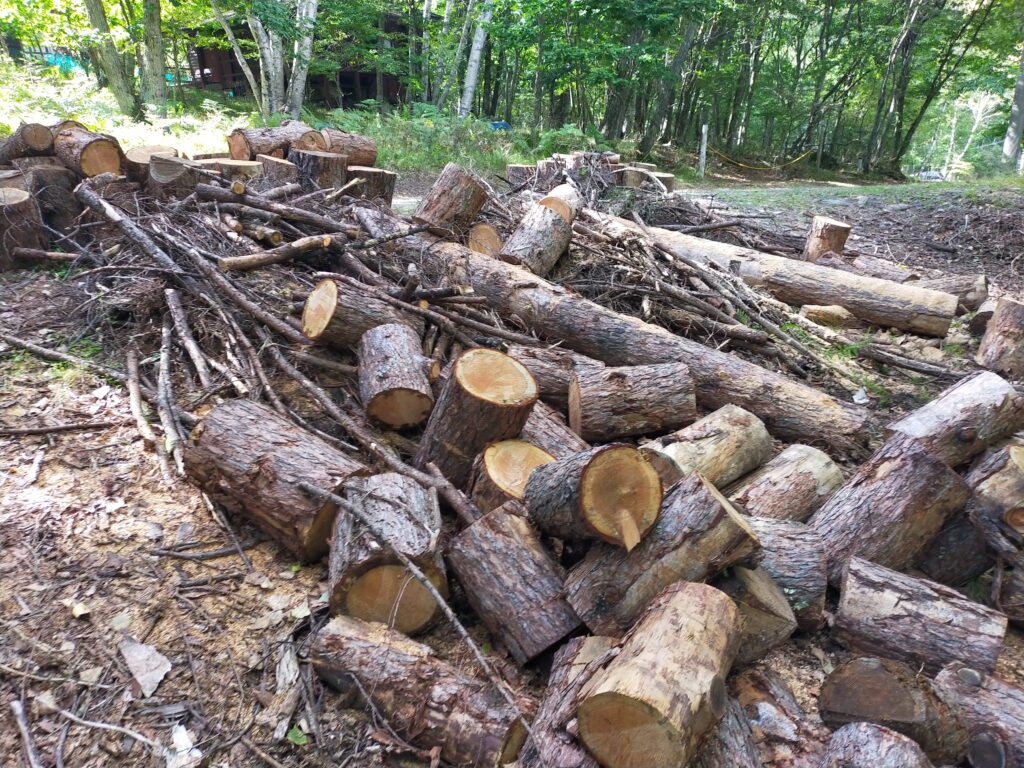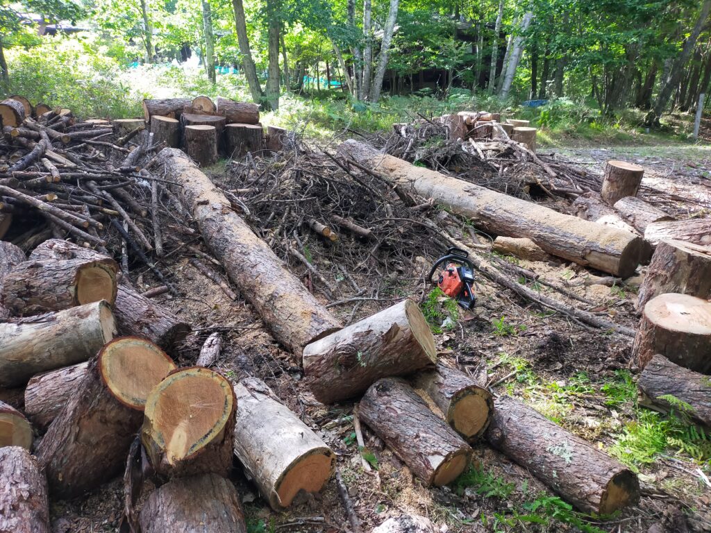 山小舎の隣の空き地に積んである丸太の玉切りをしました。