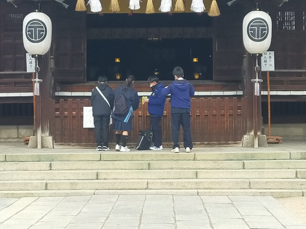 10円を納めて本殿を下っていると、研修旅行なのか県内からの中学生の男女グループがお参りに上がってくるところでした。