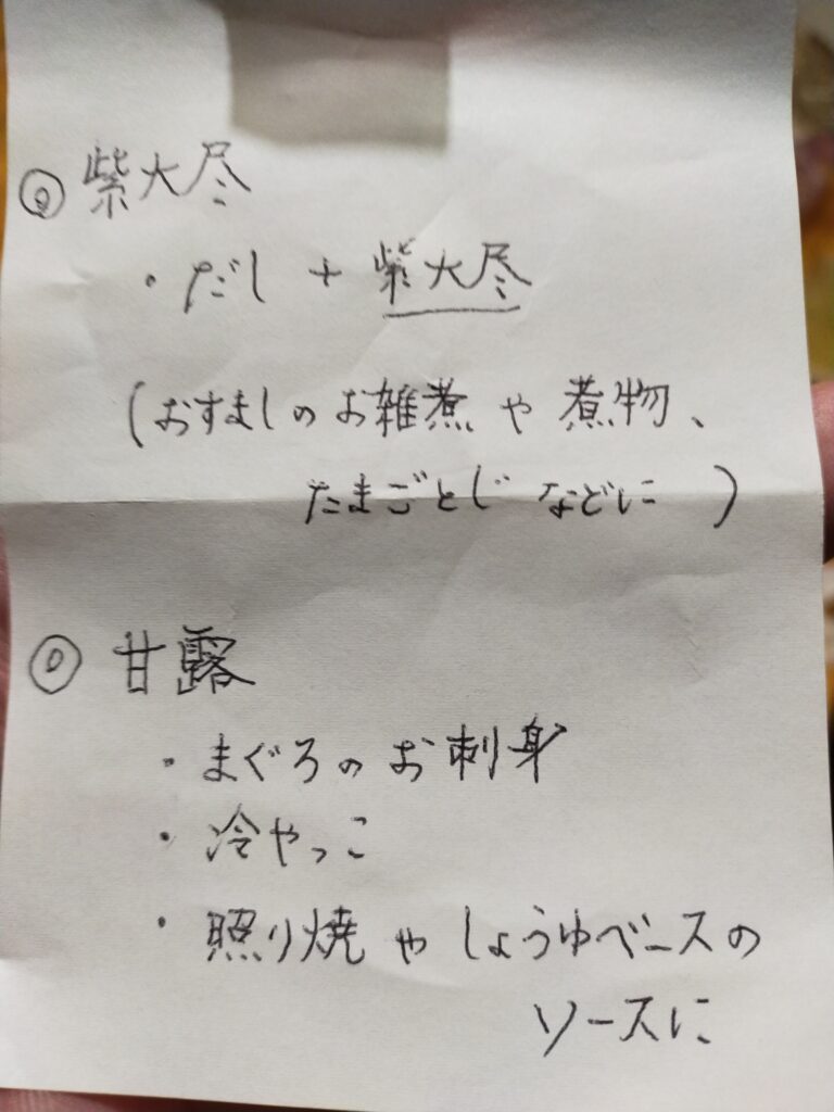 最後には2種類の醤油の特徴と利用方法をメモに書いてくれました。