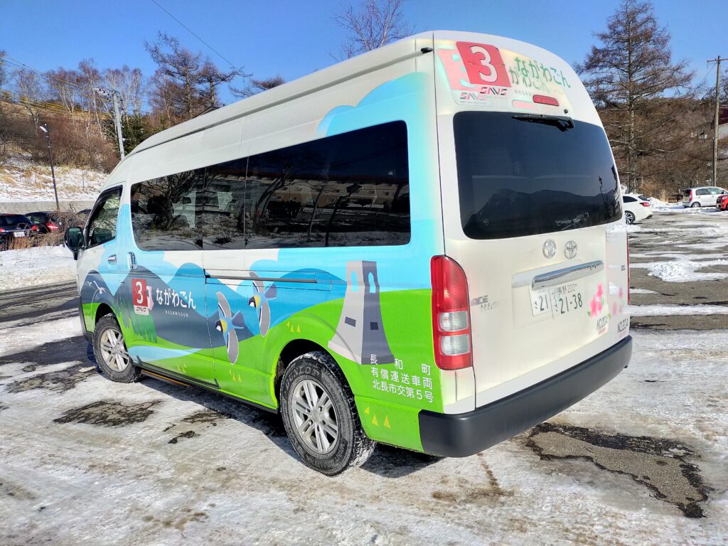 山小舎の玄関前まで来てくれて一律300円で、町内全域と白樺湖周辺、丸子中央病院やスーパーツルヤなどに行ってくれます。