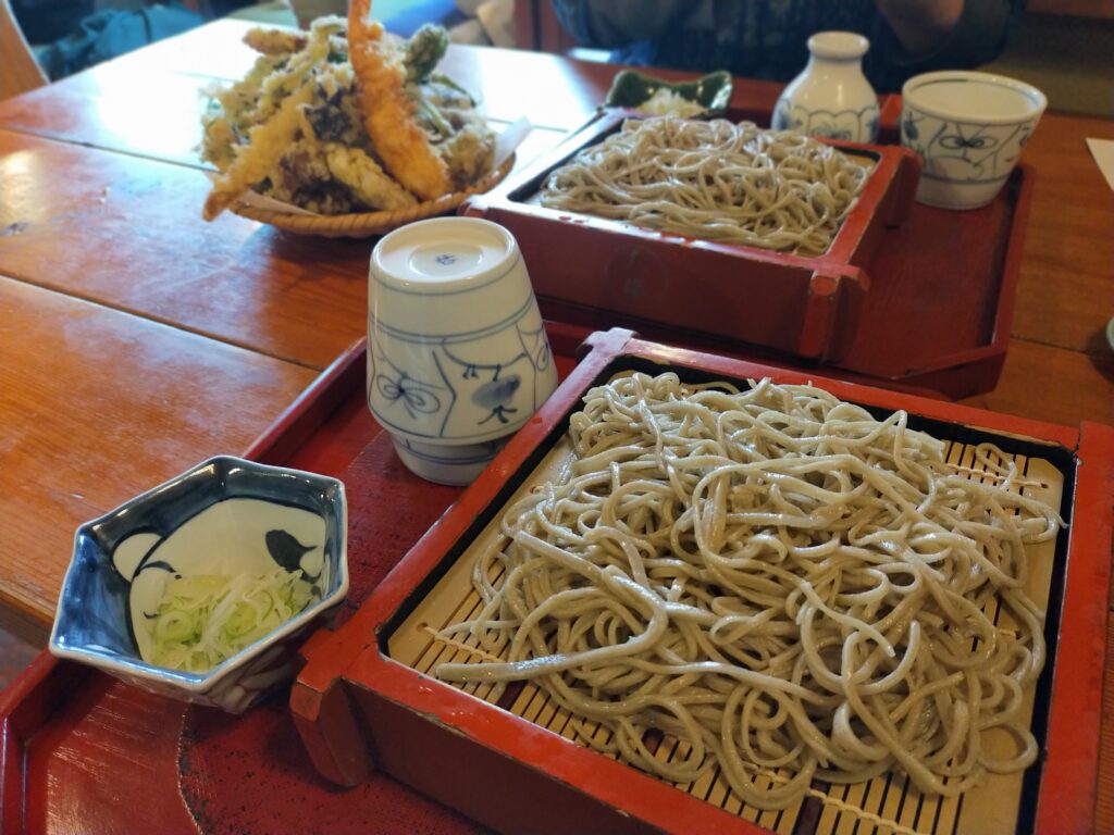 北アルプスの雪を頂いた山頂を望みながら、安曇野でそばを食べ、おやきや和菓子のお土産を買いました。