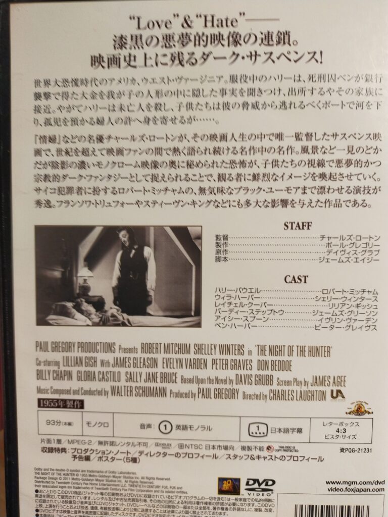 実はロリコンだったというチャールズ・ロートンと、ねっとりとしたカメラのスタンリー・コルテス、麻薬で逮捕歴のあるロバート・ミッチャムと3人のサイコ野郎の本質に近いものが集結した極め付きのカルト作品だった。