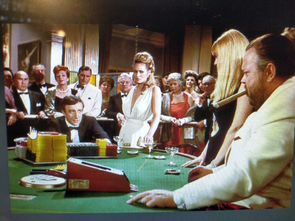カジノ王役で出演し、賭博場でなぜかマジックを見せてご満悦なオーソン・ウエルズ。